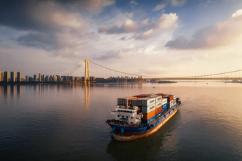 这张照片展示了一艘货船在河流中的场景,远景是一座城市天际线和一座桥。画面色彩柔和,温暖的阳光洒在船和水面上,创造了美丽的光影效果。桥梁和城市天际线提供了出色的背景和趣味的几何线条,在构图上引导了观者的视线。船的定位在画面的中央略偏下位置,增强了画面的动感和稳定性。 杨泗港长江大桥(Yangsigang Yangtze River Bridge)是中国湖北省武汉市境内连接汉阳区与武昌区的过江通道,位于长江水道之上,是武汉市第十座长江大桥。[1] 杨泗港长江大桥于2014年12月3日动工兴建;[2]于2018年12月29日完成合龙工程,大桥全线贯通[3][4];于2019年10月8日通车运营。[5] 杨泗港长江大桥西起国博跨线桥,上跨长江水道,东至八坦立交;桥梁全长4134.377米,主桥长1700米;上层桥面为双向六车道城市快速路,设计速度为80千米/小时,下层桥面为双向六车道城市主干道,设计速度为60千米/小时。[1][55]