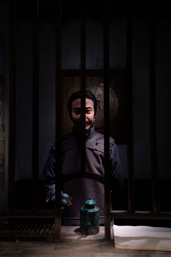《早,来看看货》:狡诈的民国商人形象,用狡黠的眼神打量着你,试图量体栽衣的从你身上谋取利益。乌鲁木齐市博物馆里有趣的布景。