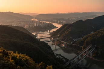 登上缙云山,嘉陵江穿行于山谷,滋养了北碚城区,一眼望去,嘉陵江上八座桥依次排开,蔚为壮观。