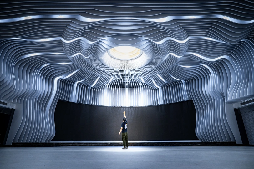 室内装修的线条美…看到现场直接有了创作的想法,人物举着手对着上面的天花板圆盘,有一种迎接光明的感觉。