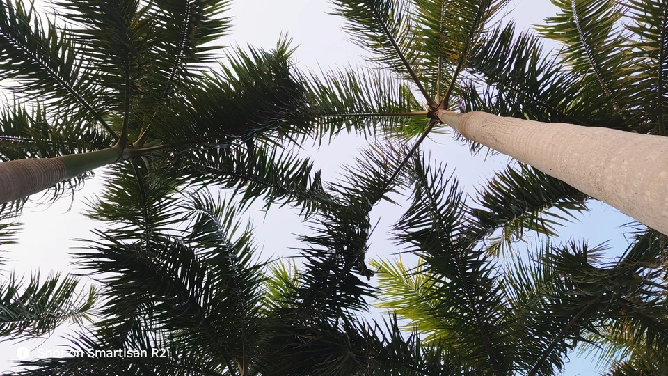 手机超广角镜头仰拍几棵树叶交错的棕榈树,树叶交集部分好似天空之眼,非常有趣。