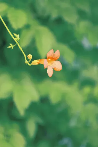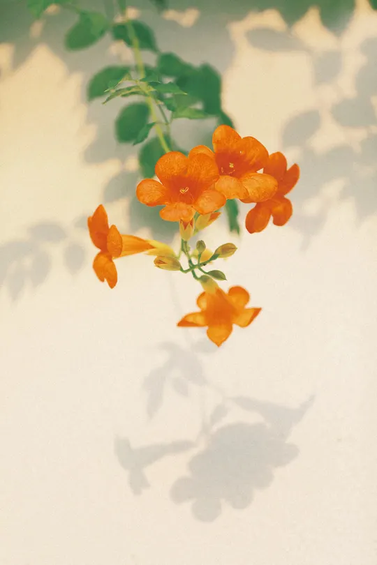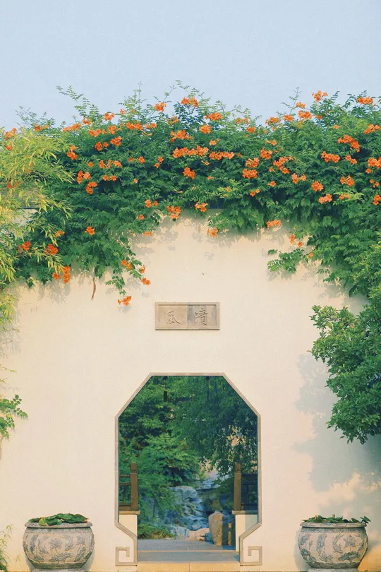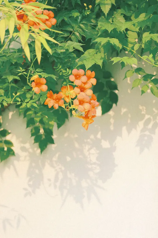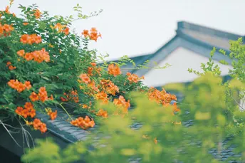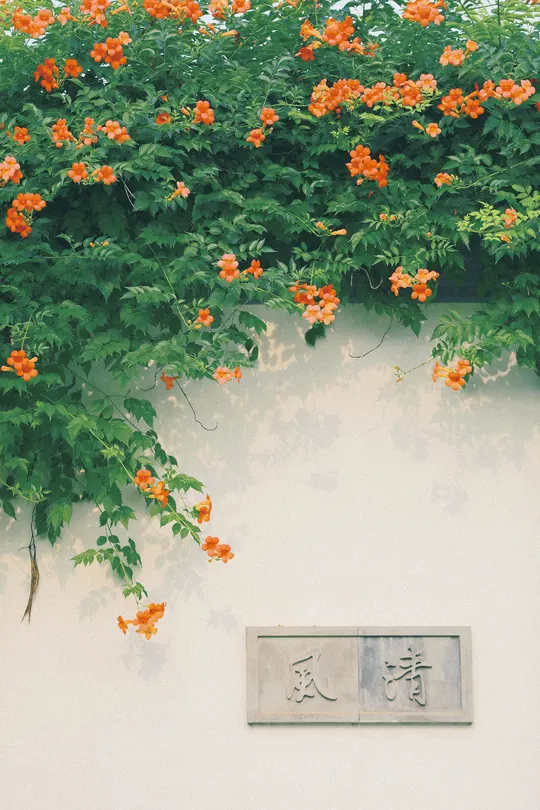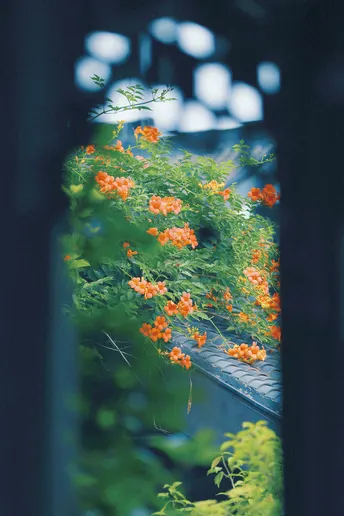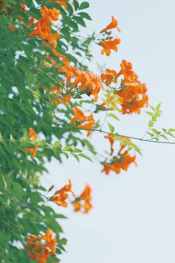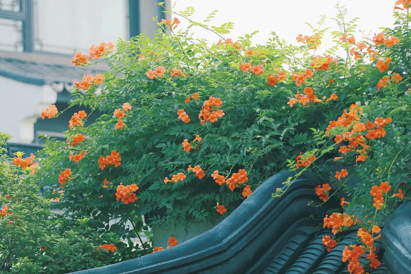 屋顶的凌霄以盛开 繁花似锦 犹如天际的彩霞 -