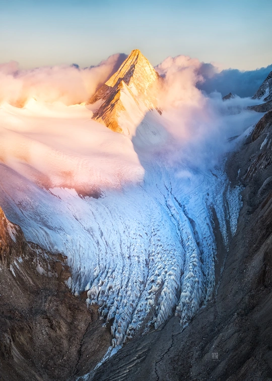 在等待一夜,半夜遇见了狼,在凌晨四点徒步到冰川迎接日出,当云雾在太阳出现时围绕着国王峰,此刻国王峰迎接了大臣们的朝拜