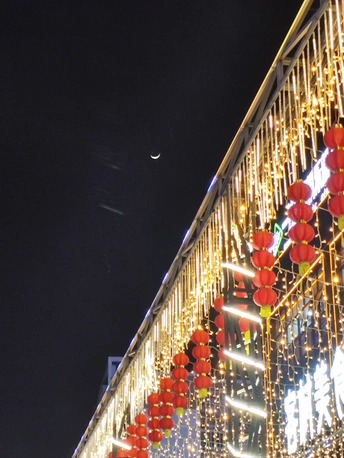 今天偶然发现库存里有一张近期拍摄的照片,一轮残月高挂在漆黑的夜空中,与霓虹灯相辉印,形成美妙绝伦的夜色。
