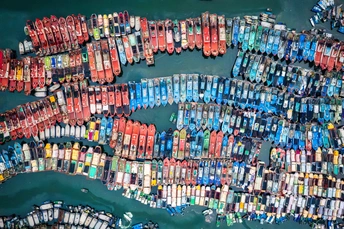 封海期的渔港,大大小小的渔船排列整齐地停靠在渔港内部。