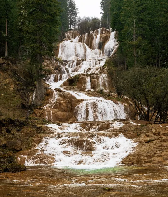 扎嘎,藏语意为岩上的激流。该瀑布是一座多层的叠瀑,叠叠多变,高104米,宽35米,为中国最高的钙化瀑布。其气势磅礴,涛声十里,每泄下一坎,便弹出一团团一簇簇晶亮透明的水花,如珍珠溅落,似孔雀开屏。