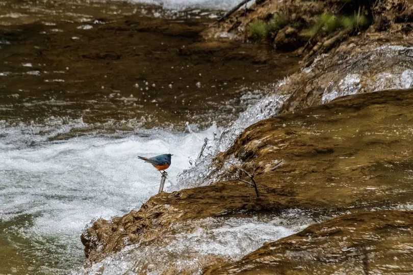 在那如诗如画的地方,白顶溪鸲灵动地穿梭着,旁边,钙华叠瀑如梦幻之景,水流层层跌落,闪耀着光芒,构成了大自然中独特而迷人的景致,让人心生陶醉与惊叹。