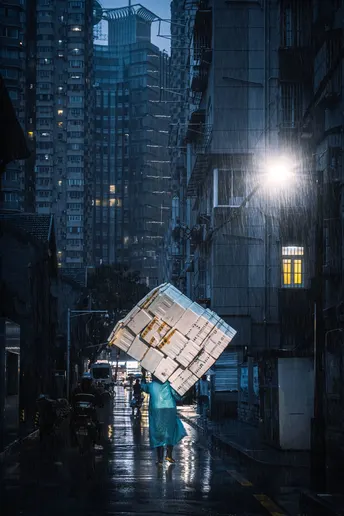 目前是这几天收获最大的一张作品,运气成分虽然有,但是为了拍到这张图片,鞋裤全湿,相机也有点点水滴。这张照片我的调色思路是冷暖对比的调色,冷色是前面的高楼大厦,暖色是楼房里的灯光,背负的人也就是主角身上的光其实偏黄,被我调成了白色的有点冷的光,如果主体是黄色的光,那就失去了冷暖对比的意义,所以我选择了本来就是暖色光的窗户,这样主体在雨中奋斗的样子和室内形成呼应,也有个故事感吧