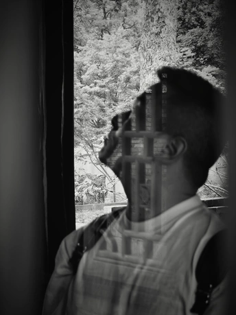 透过玻璃,人物与镜像反光重叠,有种“你中有我我中有你”的感觉,他和周围环境,物品都融合。