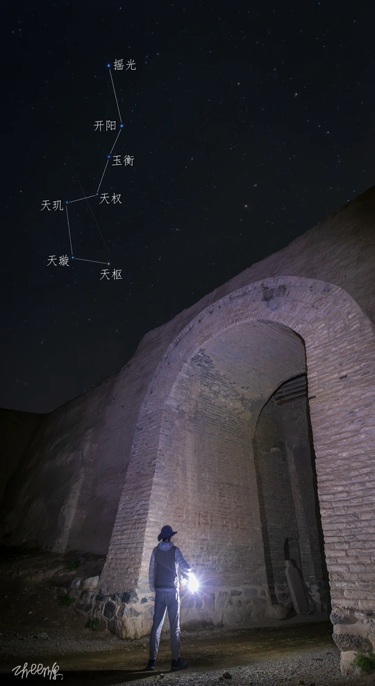 永泰古城与北斗七星同框 北斗七星,是夜空中的七颗亮星,它们组成的图形像是古代舀酒的斗,故命名为北斗七星。[1][2] [10][11] 北斗七星从斗身最前端开始,到斗柄的末尾,按顺序依次命名为大熊座α、大熊座β、大熊座γ、大熊座δ、大熊座ε、大熊座ζ、大熊座η,古时汉族天文学家分别把它们称作:天枢、天璇、天玑、天权、玉衡、开阳、摇光(瑶光)。其中,天枢、天璇、天玑、天权组成为斗身,古曰“魁”;玉衡、开阳、摇光组成为斗柄,古曰“杓”。[16]
