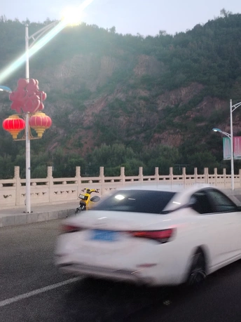 汽车高速驶过,露出电动车的半个车身