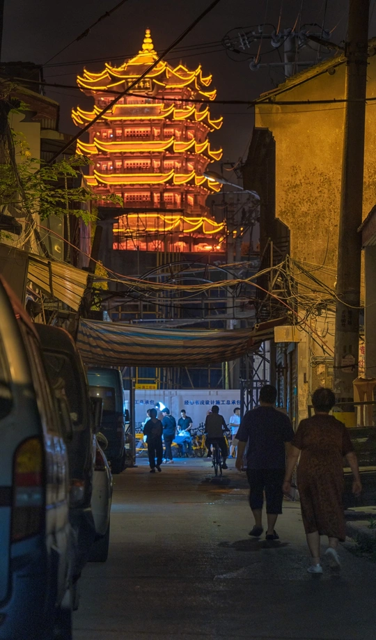 黄鹤楼与街景巷子融为一体,古今与烟火气的融合让夜晚下的黄鹤楼更有一番看头。