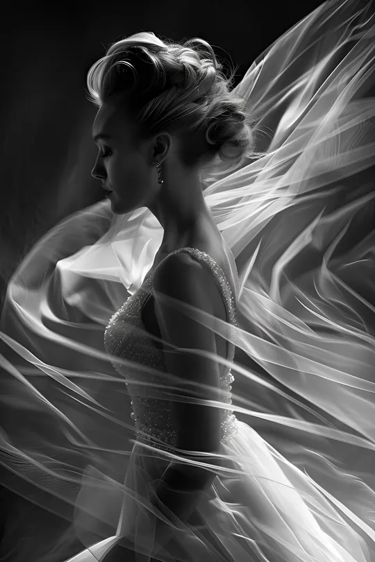 一幅黑白照片,一位漂亮女士穿着一身华丽的婚纱,优雅地站在黑暗的背景中,阳光穿透了她的头发,柔和的灯光突出细节,创造一种灵作感觉。ai绘画