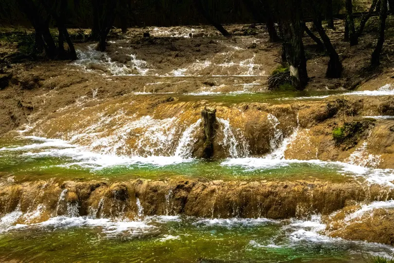 钙华叠瀑展露出令人惊叹的美。层层叠叠的钙华宛如精美的雕塑,水流顺着它们潺潺而下,水花飞溅如珍珠洒落。阳光映照下,呈现出五彩斑斓的色泽,那灵动与壮美交织,似梦幻之景,散发着无尽的魅力,让人深深沉醉其中。