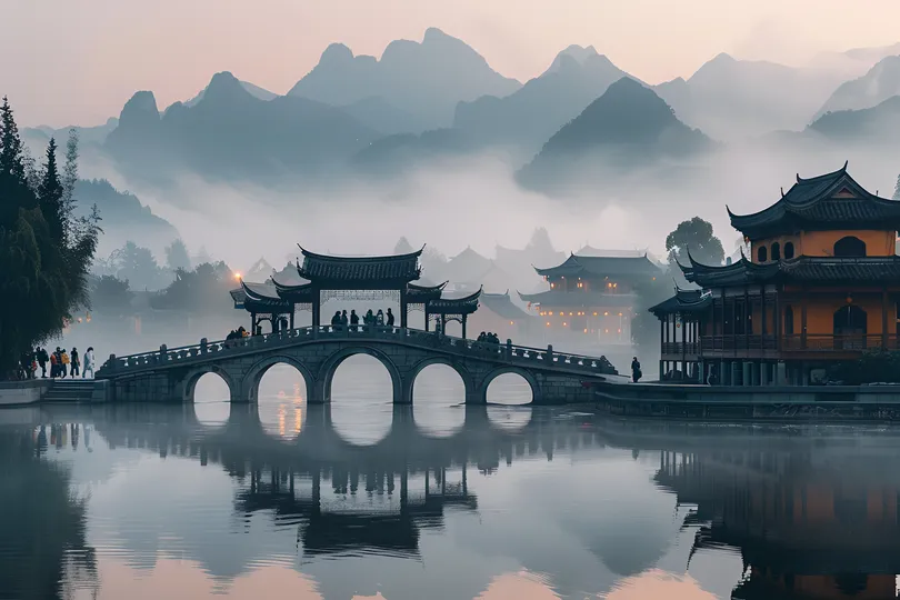 中国古代建筑和桥梁,日出时背景是雾蒙蒙的群山。人们在石拱桥上行走,水面上有倒影,柔和的灯光营造出宁静的氛围。 ai绘画