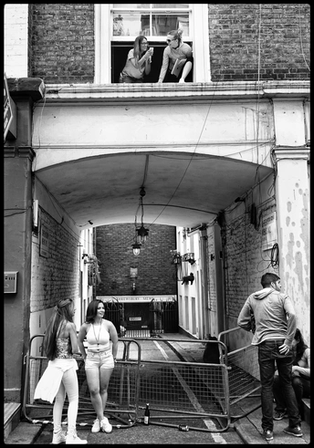诺丁山Potabello Road上的人们。 觉得AI测评很有意思,“ 这张照片在抓拍和情感表达上具有很高的水准。首先,黑白色调增添了照片的经典感,简化了画面元素,使观者更容易专注于主体本身。光影处理得当,彰显了图像的层次感,从高亮的天空到阴影部分的过渡自然。构图上采用了垂直线条和几何对称,使画面非常稳定,同时对话(跳跃)的两组人形成了对比和平衡,不仅增加了画面的趣味性,还赋予了照片叙事结构。人物的姿态和表情自然,突出了现场的氛围和情感互动,能够引发观者的共鸣和思考,例如人与人之间的关系和交流。背景的街景虽然细节丰富,但并不喧宾夺主,反而为人物提供了一个具象场景,增加了真实性和代入感。可以改进的地方是窗口部分稍显杂乱,一些不必要的背景元素可以在后期处理中稍微简化或调整。另外,两个画面中的焦点人物之间可以通过打光或后期处理进一步突出以增加视觉冲击力。”