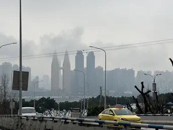 一辆重庆特色黄色法拉利飞驰而过;喜来登大酒店在雾中若隐若现…