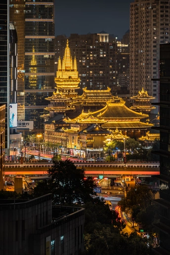 一周只开两次灯的上海地标,请观赏金光璀璨的千年古寺—静安寺! 这个视角下的静安寺夹在高楼之间,有大隐隐于市之感!