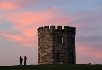 图上拍摄与悉尼La Perouse,展示出了一座古老的石质瞭望塔,映衬着色彩明丽的天空。落日的粉色和蓝色在场景中投射出柔和的光芒,突显了塔楼的历史建筑。两个人站在旁边交谈,为永恒的风景增添了人性元素。这张照片展示了悉尼丰富的历史和黄昏时分建筑地标的迷人之美。