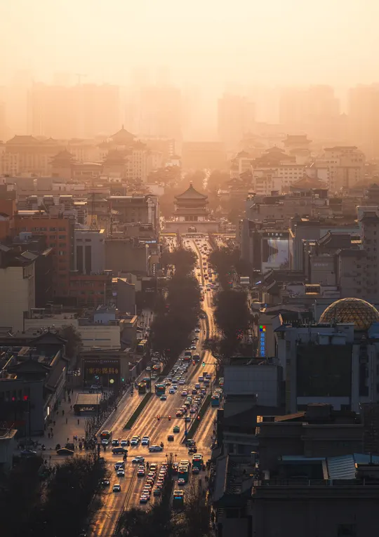 夕阳的余晖洒满了钟楼和东大街,迷雾之中隐约可以看到安定门和城墙外的高楼。