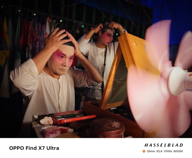 盛夏夜晚,旋转的风扇,后台,一丝不苟的,正在化妆的粤剧艺人,敬业精神令人敬佩。