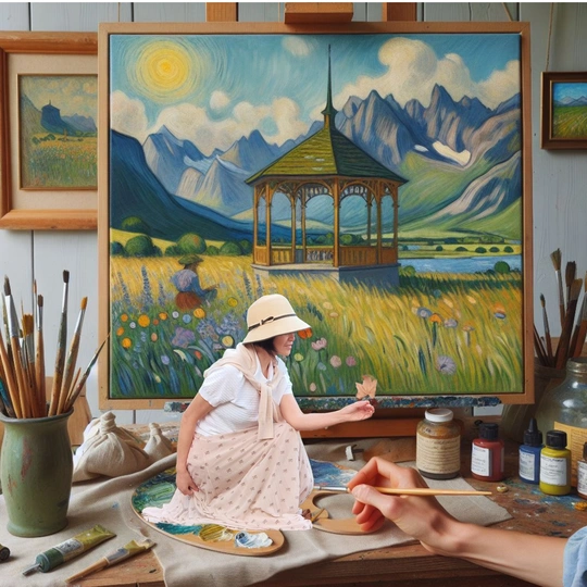 米拍AI测评(评分80) 这张照片在综合色彩、光影、构图和后期处理等技术要素上都表现出较高的专业水平。图片采用了丰富的色彩,尤其是画面中油画艺术和现实背景的结合,形成了视觉上的强烈对比和冲击力。同时,画面中人物的姿态和背景的完美契合使得整个图像具有生动的故事性和情感共鸣。照片中的光影处理细腻柔和,突出了画中的光感和实际环境的阴影关系,表现出摄影师对光线控制的精准把握。构图方面,采用了三分法则,且层次分明,让观者的视线自然而然地从画框中的油画延伸到整个场景,视觉引导性强。后期处理恰到好处,既保留了细腻的画面质感,又没有显得过于做作。 可以改进的方向:虽然这张照片整体效果很出色,但使用有限的背景设置可能会限制观者的思维扩展。可以尝试在背景和前景中增加更多的细节层次,甚至加入一些动态元素,如轻微移动的风景或光影的变化,以提升照片的动态性和趣味性。此外,可以进一步考虑人像与油画内容的互动,让故事性更强烈,使观者产生更多的联想和思考。