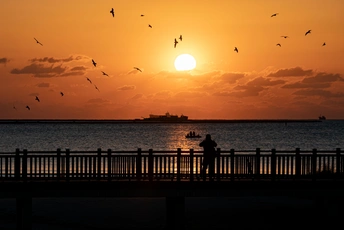 太阳,海鸥,轮船,拍照的人,一张元素丰富不做减法的照片