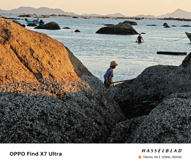 夏冂傍晚,潮水退去,正在涉水而归的渔民。