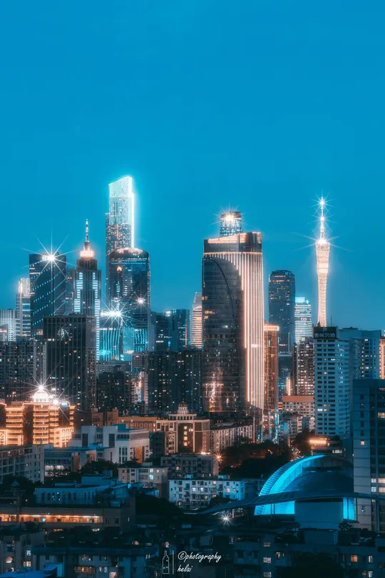 这张照片展现了广州城市的梦幻夜景,充满了现代都市的繁华与魅力。我选择了蓝调色调来拍摄这幅作品,意在将这座城市的夜景演绎得如梦如幻,仿佛进入了一个科幻世界。高楼大厦灯火辉煌,各种建筑物在灯光的映衬下显得格外耀眼,正是我想捕捉的城市活力和现代气息。 最引人注目的是那栋被霓虹灯包围的高楼,顶端闪烁着光芒,给人一种未来城市的感觉。建筑物的灯光形成了各种几何形状和线条,增添了画面的层次感和立体感。左侧建筑群的灯光较为密集,呈现出一片璀璨的光海。而右侧的广州塔则像一根通天的光柱,巍然耸立,在夜空中显得格外突出。 在照片的下方,是一些较低的建筑和街区,与上方的高楼形成了鲜明的对比。这些低矮的建筑物灯光较少,但它们在蓝调色调的笼罩下,显得温馨而宁静。这样的对比不仅展现了广州这座城市的多样性,还突出了城市的发展与变迁。 构图方面,我选择了一个较高的拍摄角度,从而能够俯瞰整个城市的夜景。照片的前景、中景和背景层次分明,给人一种空间上的深度感。尤其是远处的高楼和近处的低矮建筑,使得整个画面显得更加丰富和饱满。 总的来说,这张照片不仅展示了广州夜晚的美丽和繁华,还通过蓝调的运用赋予了画面一种独特的艺术