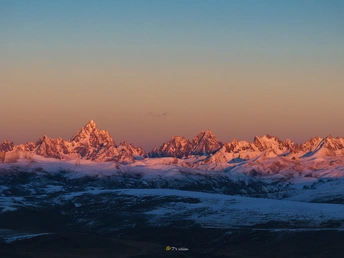 在深秋的日落时分抵达鱼子西后匆忙升起无人机,本打算主要拍贡嘎和雅拉雪山的日照金山,但发现位于两山之间的雪山群被日落余晖照耀的格外醒目, 蓝调时刻将天、山、地分成了淡蓝,粉色、深蓝色,共三种层次的色彩,格外好看!