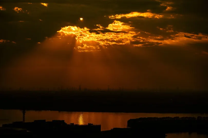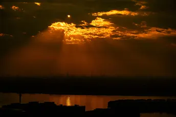 夕阳穿过云层映射在湖面上
