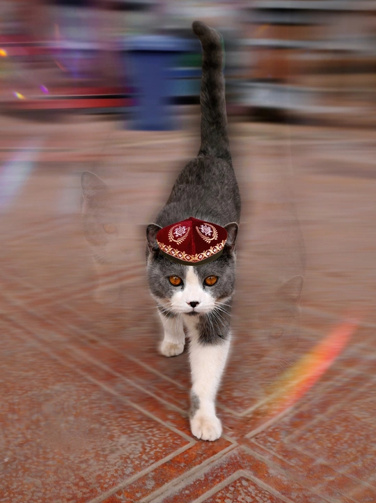 当看见这只橘红色眼睛的猫大摇大摆走在喀什古城里时,感觉它浑身有种魔力,再给它P顶帽子,这异域神秘感不要太浓郁😜