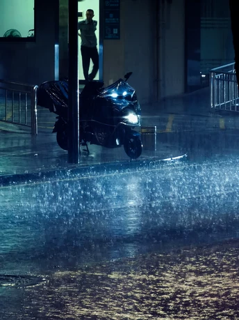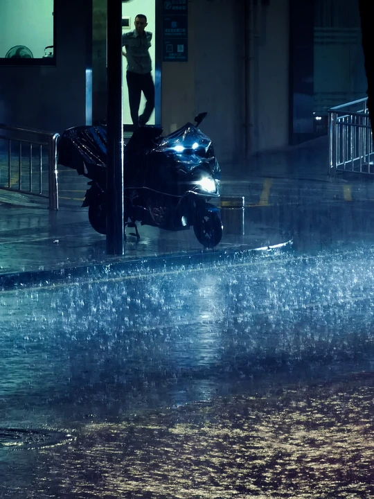 暴雨中的人与摩托