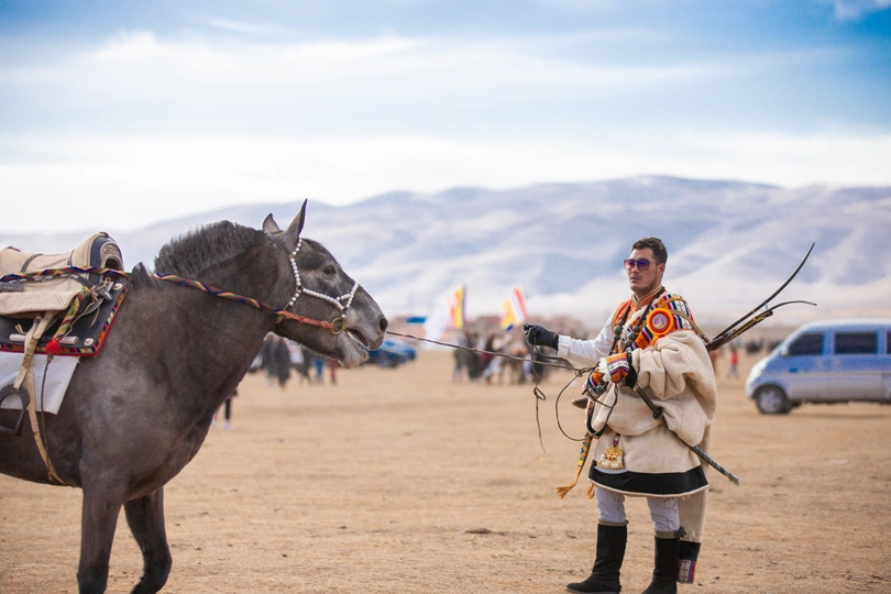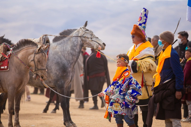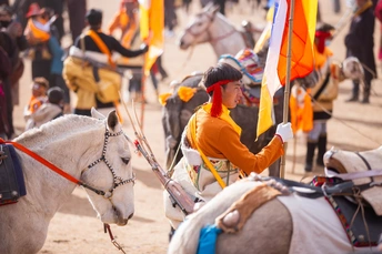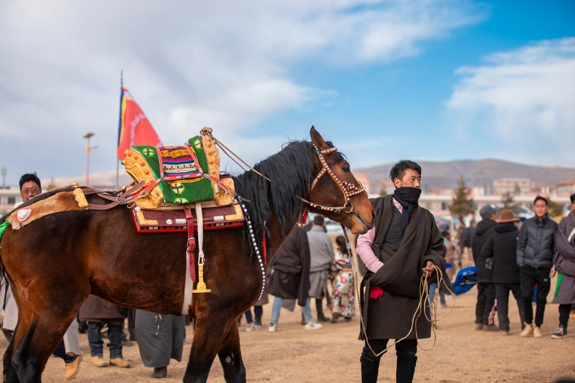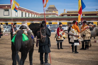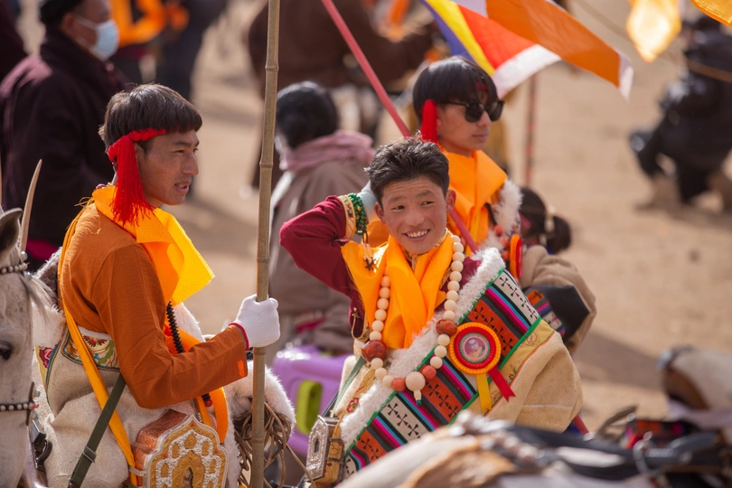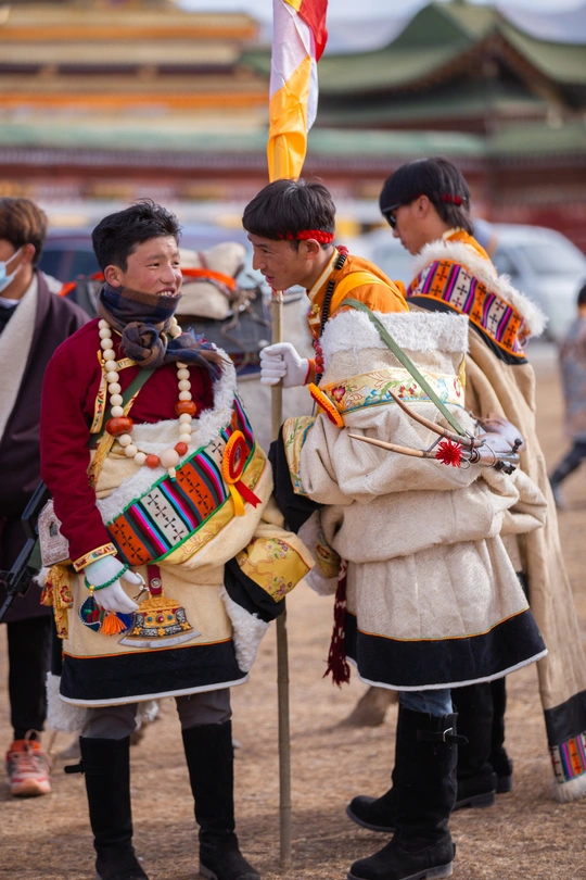 一大早,寺庙门口旌旗招展,来自附近各个村寨的藏族同胞,身着华丽的民族服装,佩戴着贵重的饰品,在寺庙前云集,为跳神前的巡游做准备。
