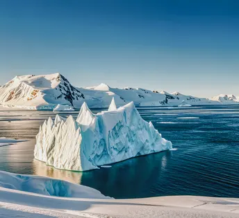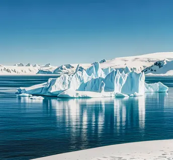 在澄澈湛蓝的天空之下,悠然漂浮着一座硕大无朋的冰山,其倒影于水面清晰可辨。冰山的周遭是一片静谧的深蓝色水域,遥远处则是绵延着被皑皑白雪覆盖的山峦。