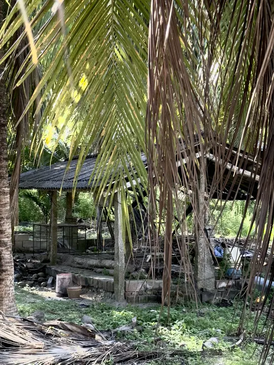 这张照片显然属于自然和乡村生活摄影类别,展示了一个被树叶包围的小屋,整体氛围宁静而自然。从色彩上看,绿色植被与黄色树叶形成了颜色对比,给人一种和谐美好的感受。然而,光影处理稍显平淡,没有充分利用光线的变化来增加画面的立体感和层次感。构图上,前景的树叶占据了画面的大部分,虽然有遮挡效果,但略显杂乱,削弱了主题的突出。
