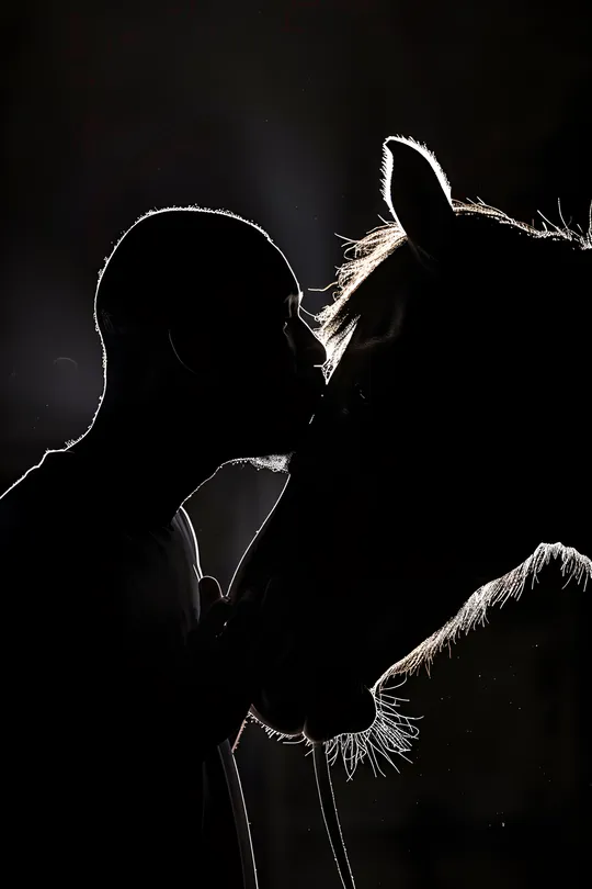 人马亲吻的剪影,黑色背影,高对比度,深色艺术风格,高分辨率,高质量,高细节,锐利的焦点,景深,戏剧性的灯光,超现实主义,明暗对比。ai绘画