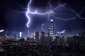 7月10日的夜幕降临之际,预示着一场不同寻常的自然现象即将上演!随着夜色的加深,雷声轰鸣,电闪雷呜的壮观景象在这座城市的天际线上展开,在这场雷雨中,最为引人注目的一幕莫过于闪电击中了上海的标志性建筑一东方明珠塔的塔尖。那一瞬间,光与影的交错使万物无所遁形,那瞬间出现的巨大光柱,犹如通向另一个世界的门户。电光与塔尖的金属结构产生了强烈的视觉冲击。在这风雨交加的夜晚,闪电如同一把画笔,在天空中勾勒出千变万化的图案,它如同大自然的艺术家,将黑暗的天空装点得无比绚丽。