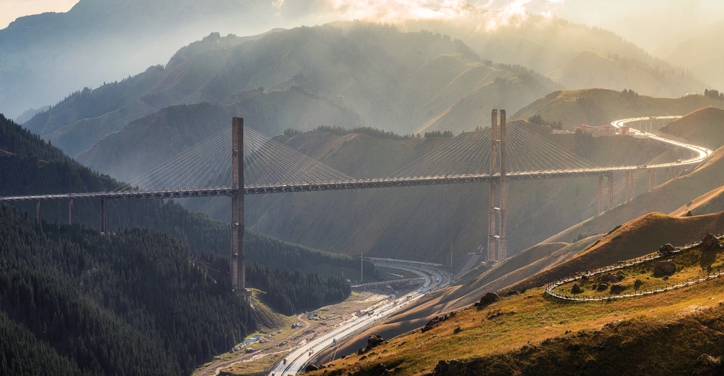 雨后的果子沟大桥,阳光从侧面照射,金光闪闪