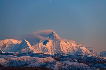 当太阳即将落到地平线的那一刻蜀山之王贡嘎神山被披上了一道橘粉色的圣衣,以巍峨之姿屹立在川西大地上!