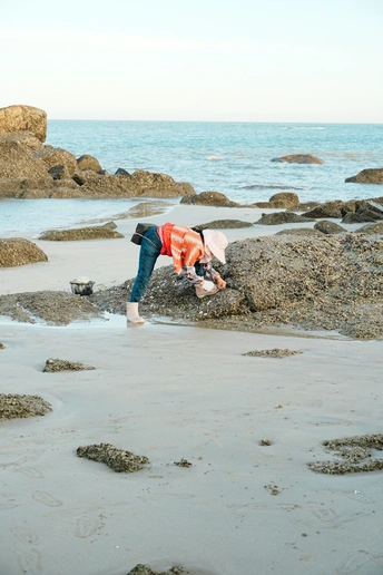 在日落之前在玉沙湾偶遇一位捡拾贝壳的人,她其动作和姿态能够引起我对海边拾趣活动的共鸣。海水的蓝色与岸边沙子的暖色调形成了对比,增强了画面的视觉层次感。光线柔和,反映了海边的宁静氛围,我就赶紧捕捉了人物与自然的互动瞬间。