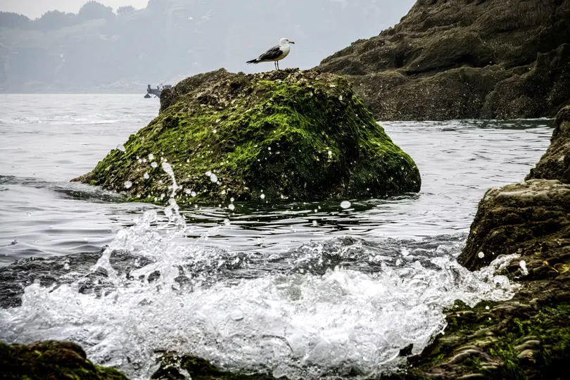 浪涛拍岸,发出阵阵轰鸣声。汹涌的海浪不断冲击着海岸,溅起朵朵白色的浪花。独立礁石之上的海鸥,身姿挺拔。凝望着远方,任由海风拂动羽毛,仿佛在沉思,又似在享受这澎湃与宁静交织的美妙时刻。