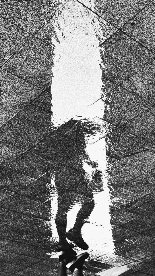 利用下雨时候,地面积水的反光,拍下雨中前行的路人倒影。
