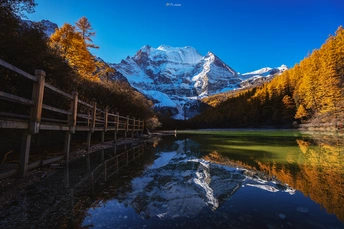 仙乃日神山和周围金黄的树林倒影在绿宝石般的珍珠海中,这是神的自留地!