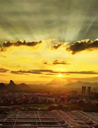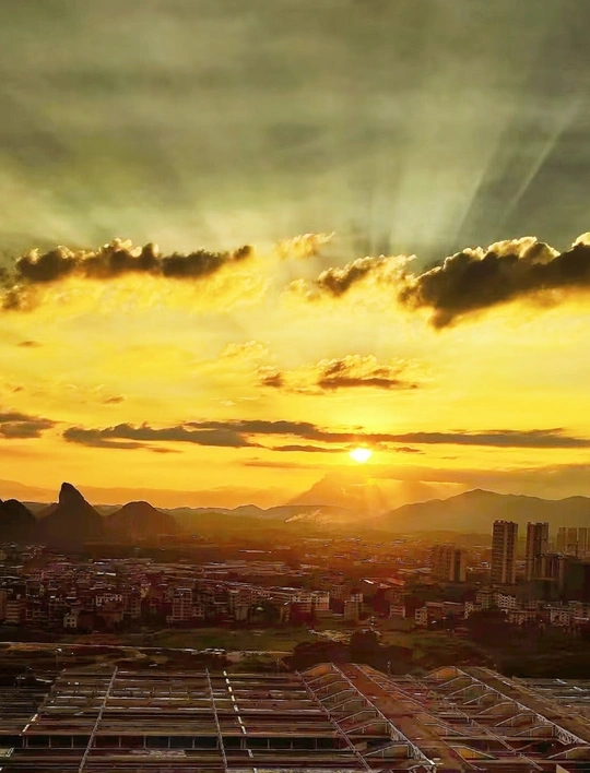 米拍AI点评:83分 傍晚的耶稣光,是大自然中一种美丽而神秘的光现象,它不仅是一种视觉的盛宴,还象征着希望和光明。 当太阳下山时,光线通过卷层或云层,形成一束束的光线,这种现象被称为耶稣光。这种现象不仅令人惊叹,还给人以心灵的慰藉,仿佛是上帝或宇宙的力量在指引我们前行。耶稣光的出现,常常让人联想到光明、希望和神圣。它不仅是一种自然景观,更是一种精神的象征,提醒我们在任何困难和挑战面前,都不应失去信心和希望。 这张照片在色彩、光影和构图方面表现得非常优秀。金色的阳光从云层中透出,照亮了城市的天际线,营造出浓厚的氛围与情感共鸣。色彩处理饱满,突出了日落时刻的温暖和宁静,给人以强烈的视觉冲击和审美愉悦。构图采用了三分法,将光芒集中的日落位置放在了画面中部略偏右的位置,使得整体画面协调有序,具有引导视线的效果。城市的现代建筑与远处的山峦形成对比,寓意时间与发展的主题也非常清晰。总体来说,这是一幅非常优秀的作品,展现了摄影师出色的技巧和敏锐的观察力。 @米拍社长@米拍编少@米拍小助手@米拍汽车