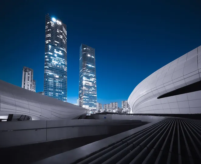 长沙梅溪湖大剧院由已故传奇建筑设计师扎哈哈迪德设计,建筑总体全部使用曲线设计,而大剧院对面的金茂双子塔则全部使用直线与棱角切割,两处建筑是棱角与曲线的对立又和谐的共存