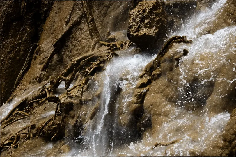 钙华之上,湍急的水流奔腾而下,水花四溅开来。那晶莹的水珠在阳光的照耀下闪烁着璀璨光芒,如同无数颗钻石散落。水花跳跃着、飞舞着,每一颗都带着灵动与活力,奏响着欢快的水之乐章,让人感受到大自然蓬勃的力量与无尽的魅力。