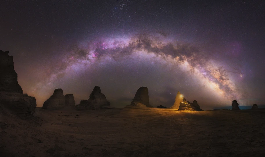 站在广袤而寂静的俄博梁,我小心翼翼地架好相机,感受周围古老的岩石阵。当太阳落下,黑暗笼罩大地,星星开始在天空中闪烁,创造出一幅令人惊叹的画卷。我手提灯笼,站在高耸的岩石之间,旨在捕捉头顶上那壮丽的银河
