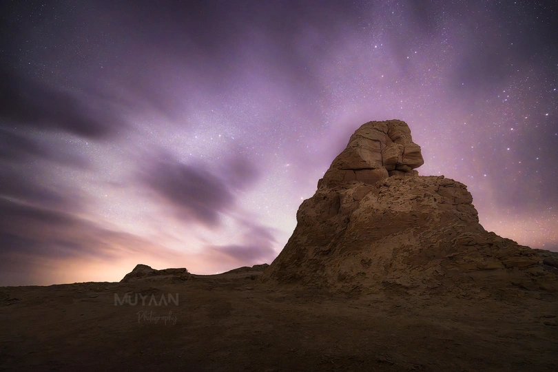 俄博梁里有个酷似狮子的雅丹。石狮形状的岩石在夜晚的星空下显得格外雄伟,仿佛在守护着这片荒凉的土地
