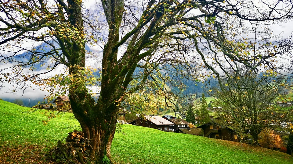 秋意浓,古树金装,宁静村庄伴山峦。炊烟袅袅,心归远方,梦回乡野田园风光。